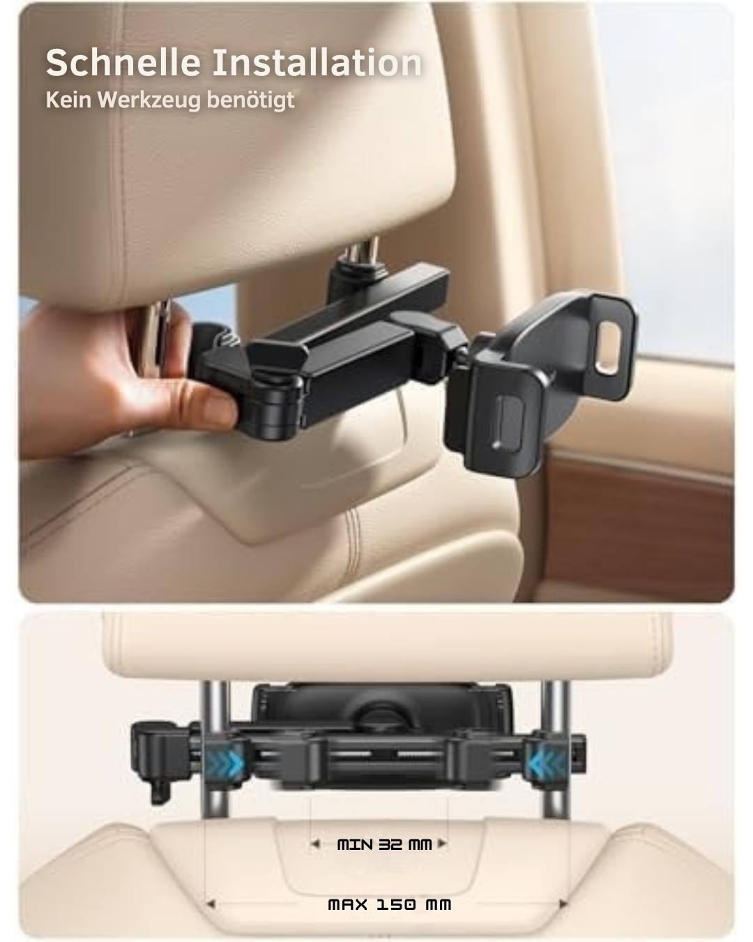Nein, du brauchst kein Werkzeug! Holdy wird einfach zwischen den Kopfstützenstangen eingeklickt und festgedreht – die Montage dauert nur wenige Sekunden und ist komplett werkzeugfrei.